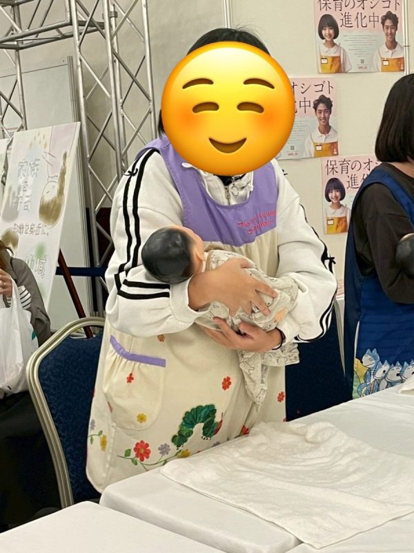 保育の体験ブースで、赤ちゃんの抱っこの仕方やおしめの取り替え方を体験しました!