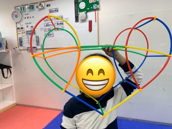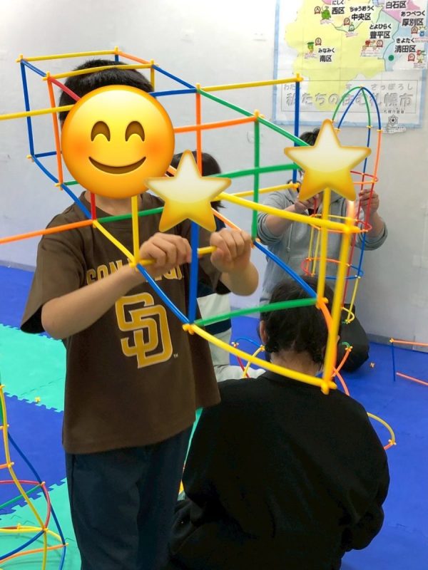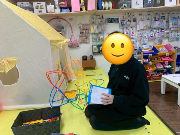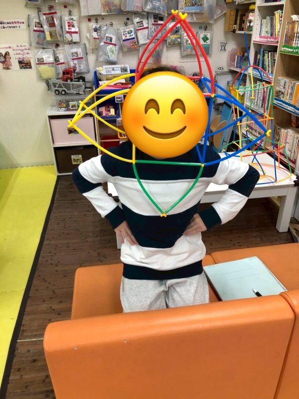 2025.12.01 室内遊び♪ こんにちは! 今回は子ども達が最近ハマっているおもちゃについて紹介したいと思います。 名前を「チューブブロック」と言い、ストローのようなブロックを黄色の部品に組み合わせていき、色々な形を作っていくおもちゃです。 上手く作れば星やハートのような形も作ることができます! 四角形をたくさんつなげて大きな四角形を作りました!どこまで大きくすることができるか挑戦していました。 たくさんつなげることで自分が入れる家ができました! « 前の記事へ