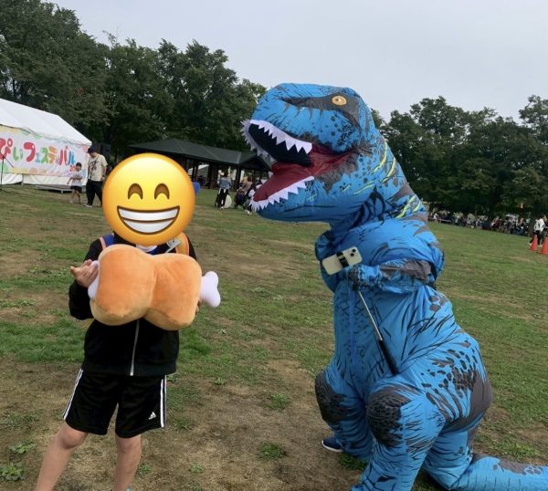 恐竜の着ぐるみを着てボールを落とさず運ぶレースに児童と職員で参加しました☆