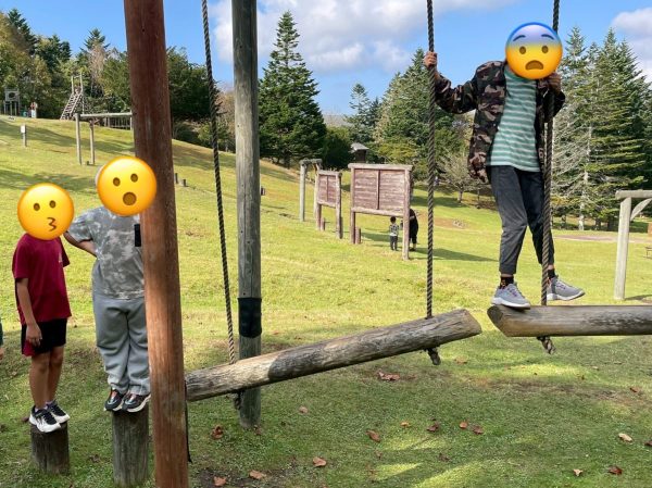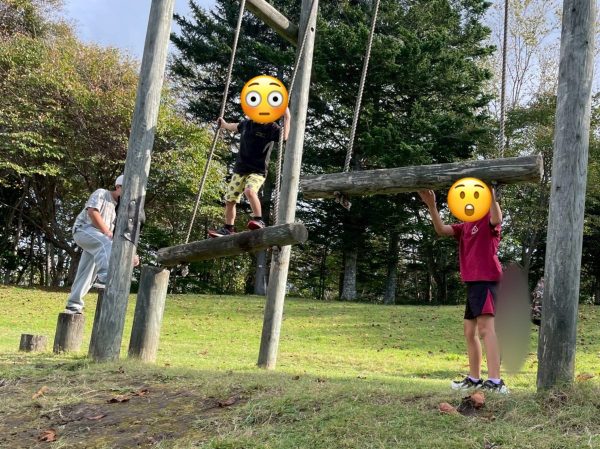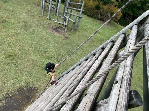 大きなアスレチックがたくさん!おっかなびっくり、「揺れるからまだ乗ってこないで!!😭」と、離れて順番待ち(笑)