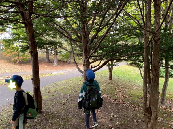 「熊が出るから熊の沢公園なのかな?」「熊が出たらどうするー?」「倒す!!」なんて話しをしつつ、枯れ葉をさくさく踏みながら、ぐるっと遊歩道を歩いていると