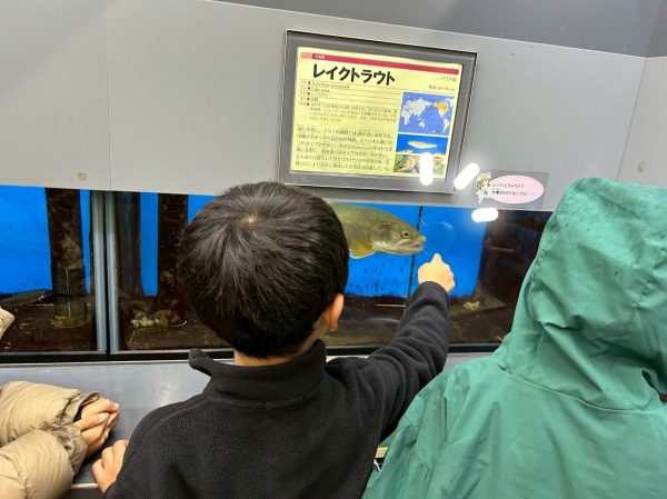 中には産卵後の鮭もちらほら。「もう動かないの?」「死んじゃうの?卵を産んだから?」