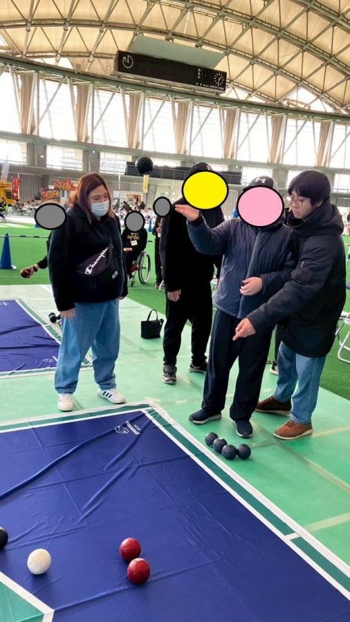 ボッチャを体験しています!青チームと赤チームに分かれて互いにボールに近づけられるように頑張っております!!