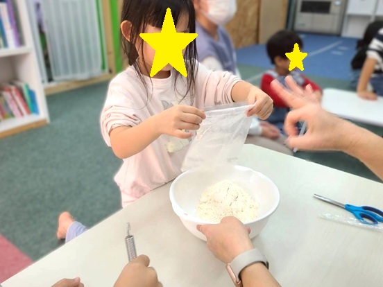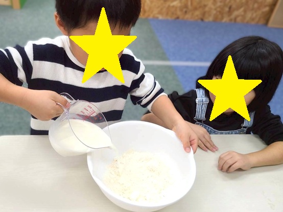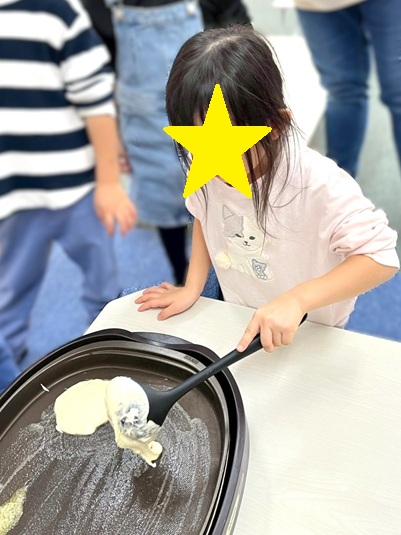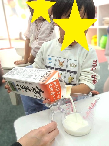 ホワイトボードには‘‘こなをいれる”、‘‘ぎゅうにゅうをいれる”と書いてあり、「クレープ?!」「卵は使わない料理?」といろいろな声が🤭🤭