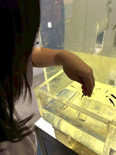 小さな魚がたくさんいる水槽に手を入れてみると…パクパクパク!と食べに来てくれました😯