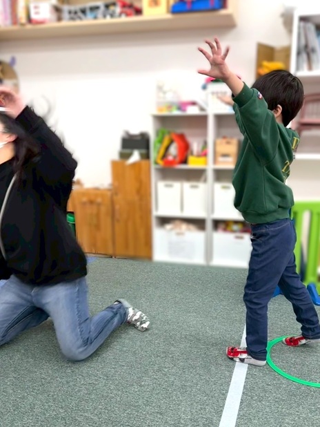 スタッフが豆チーム、子どもたちが鬼チームになってじゃんけんをして、勝った方が負けた方に攻撃ができます💥