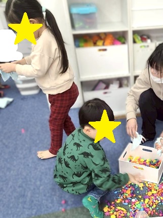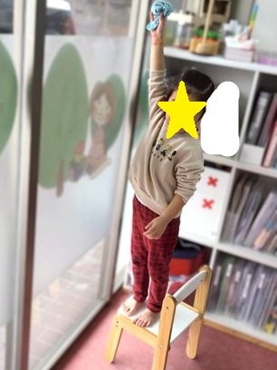 遊びたい気持ちを我慢して、いつも使っているおもちゃや絵本を丁寧に拭いています🫧